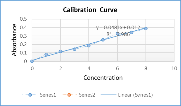 10ml of stock solution (1000/ml) was taken into 100ml volumetric flask and volume was made upto100 ml with methanol to obtain solution in the concentration 100/ml. from the stock solution 1 ml was pipette out(100/ml) and transferred into the 100ml volumetric flask then volume make was done to make the solution(10/ml). from this solution 1ml was taken into the10ml volumetric flask and volume make up done to make the solution (1/ml) in the same way different dilution done 2/ml, 3/ml, 4/ml,5/ml6/ml, 7/ml.the absorbance of each dilution was measured in triplicate from the selected wavelength using methanol as blank then calibration curve was plotted absorbance verses concentration9.