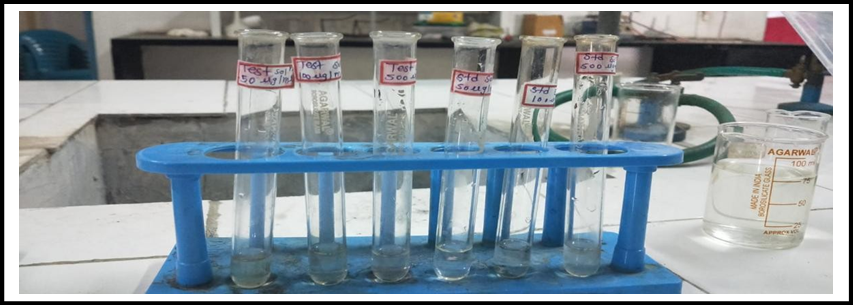 c) Test for amino acids (Ninhydrin test):- 3ml of test solution was heated and 3 drops of 5% Ninhydrin Solution was added in boiling water and was boiled for 10 min. Purple and bluish color indicates presence of amino acid.