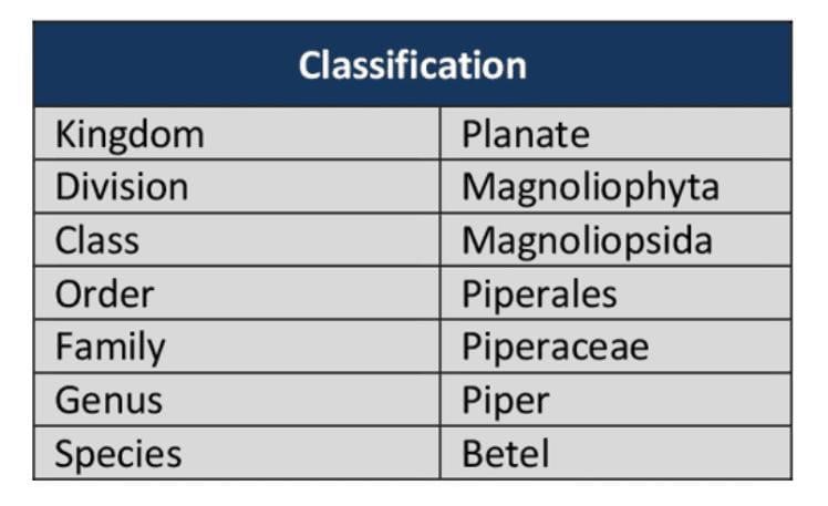 Collection of plant material Betel leaf were obtained in fresh form from the local market. The taxonomical classification of plant is given above lin the table