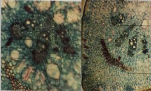 The juvenile stem's transversely sliced surface has irregular rings of vascular bundles and a rectangular contour. With three to four vascular bundles beneath the wings that are more developed than those at the flat sides, this is parallel to the epidermis' underside. This section has many air cavities and is conjoint, collateral, with a cap of bast fibers surrounded by idioblast that contains calcium oxalate cluster crystals. Except for the flat, broad side of the old stem, the entire ring of vascular strands with a well-developed cambium ring is visible.