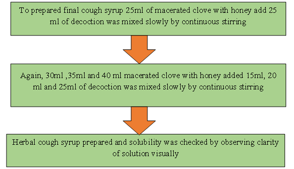 Many people have common issues of coughing. There are two types of coughs: dry cough and wet cough. Syrup is a popular form of medication for cough and cold due to its ease of use for patients. Herbal syrup is the most preferred form of treatment for cough, as it offers benefits over synthetic syrups. Herbal cough syrup is made using ingredients such as Clove, Tulsi, Cinnamon, Honey, and pudina. This unique combination of herbs is highly effective in treating cough, as well as common cold, respiratory disorders, and nasal problems. In this study, four batches of honey-based herbal syrup were prepared with concentrations of 25%, 30%,35% and 40% w/v. The quality of the final herbal syrup was assessed based on pre-formulation and post-formulation parameters including density, viscosity, pH, and various organoleptic characteristics. The current market for herbal syrups is extensive, with a growing demand for natural and herbal remedies.