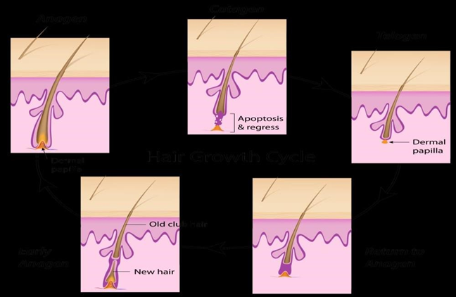 The hair growth undergoes a tiresome cycle where the anagen phase followed by the catagen and the telogen phase (7). In the anagen phase, the hair is actively growing while in the catagen phase it is characterized by the degeneration and resorption of the lower region of the hair follicle. The resting phase, where the hair is inactive, is called telogen phase after this phase the growth of the hair follicle resumes in the scalp, a hair growth cycle has three main phases: Anagen, catagen, and telogen. The anagen phase is the growth cycle typically lasts 35 years. On a healthy scalp, there are approximately 1,000,000 hair and 90% of the follicles are continually in the anagen phase of hair growth. The catagen stage follows the end of the growth period when a follicle begins to become dormant. The telogen stage is a dormant or resting period that lasts 3-4 months. When the dormant phase ends, an old hair falls out. A hair follicle then returns to the anagen stage, and a new hair begins to grow. An average rate of hair growth is about half an inch per month depending on hair follicles and age of an individual. On average, 50-60 scalp hairs are lost daily in a normal hair growth cycle and new hairs begin to grow from these follicles. Hair loss begins when less new hair begins the regrowth stage