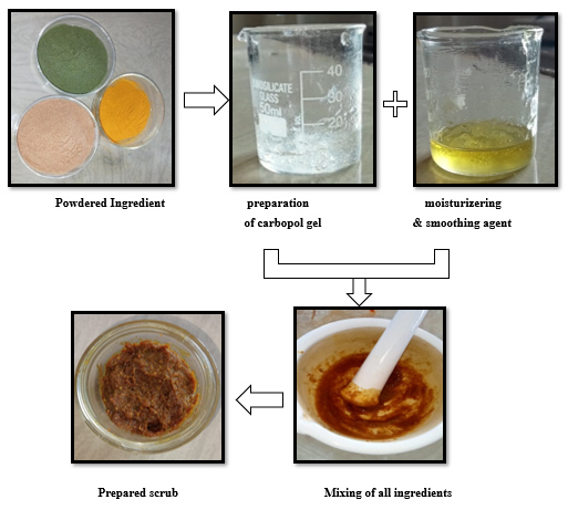 In this study, we developed a herbal scrub gel and evaluated its effectiveness based on several key parameters. The results indicated that the formulation is safe for topical application and helps improve skin health and radiance without causing adverse effects. The incorporation of pomegranate as a natural exfoliant enhanced the scrub’s overall performance. Regular use of the scrub may support improved blood circulation and oxygenation of the skin, leaving it feeling smoother, cleaner, and more refreshed. Our primary goal was to formulate a natural facial scrub using plant-based medicinal ingredients to ensure both stability and efficacy. The resulting product contains exfoliating agents that help cleanse the skin, eliminate impurities, and promote an instant glow. Additionally, the active compounds in the herbal scrub possess antibacterial and antimicrobial properties. Unlike formulations containing parabens or sulfates—which may not be suitable for all skin types—our herbal scrub offers a gentler, more skin-friendly alternative. Compared to synthetic options, it demonstrates greater benefits with minimal side effects when prepared using natural components. It is suitable for people of all ages, causes less irritation, and provides visible improvements in skin appearance. Based on our findings, we conclude that this herbal face scrub is a promising natural skincare solution that effectively exfoliates and revitalizes the skin.