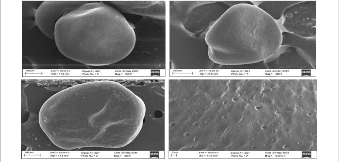 The size of microspheres was determined using microscope fitted with an ocular micrometer and stage micrometer. The SEM was used to visualised the surface morphology of the optimised raspberry ketone microspheres. The SEM images indicate the free flowing, identical and circular microsphere [19]. The surface of the microspheres smooth, it existed on the microsphere surface. It is attributed that with increase the polymer concentration that increase the particle size with smooth surface of microspheres was noticed.