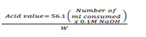 The following values are utilized: 56.1 molecular weight of KOH, M- morality of KOH, V- volume of KOH used, and W- sample weight.