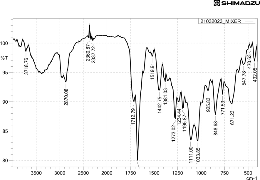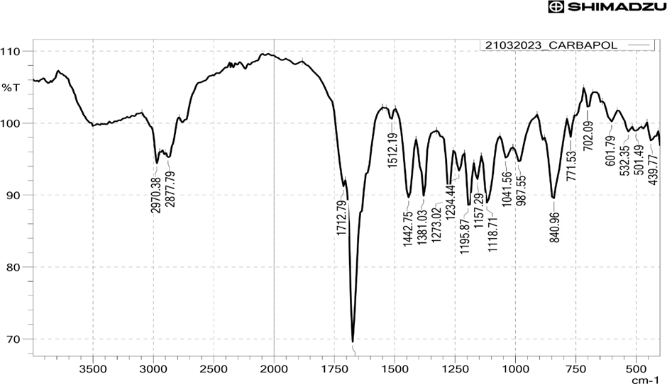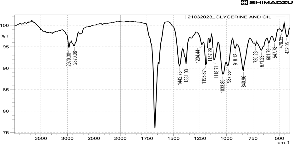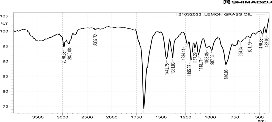 To investigate the compatibility of drugs and excipients for integration into emulgel. The FTIR spectra of pure drugs and drug-excipients combinations were between 4000-400 cm−1. No more peaks belonging to functional groupings were found. There were no significant differences between the IR peaks of lemongrass oil and lemongrass oil-excipients mixes, indicating that the medicine is stable in the presence of all excipients.