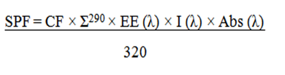 Mansur equation: To provide an in vitro assurance of SPF employing UV spectrophotometry, Mansuretal. (1986) built up a straightforward numerical condition that is practical, rapid, and simple in activity. where Abs is the sunscreen product's absorbance, CF = correction factor (=10), EE (I) = erythemal impact range, and (I) = solar intensity spectrum. The EE × I estimation is always the same.