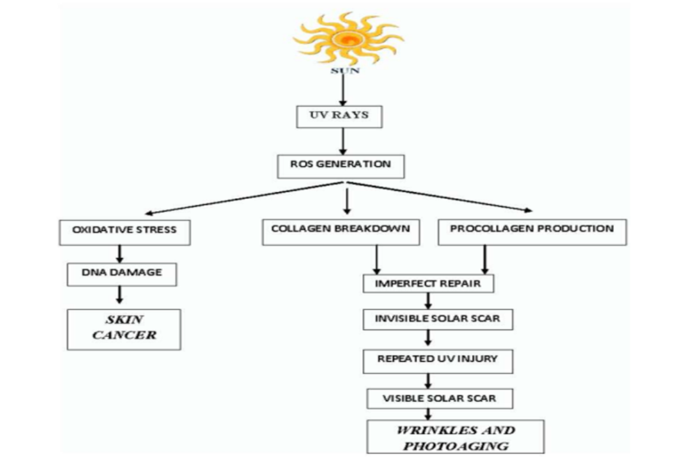 for instantaneous skin darkening or tanning brought on by the epidermis's overproduction of melanin, early photo aging, immune system inhibition, or even endothelial necrosis