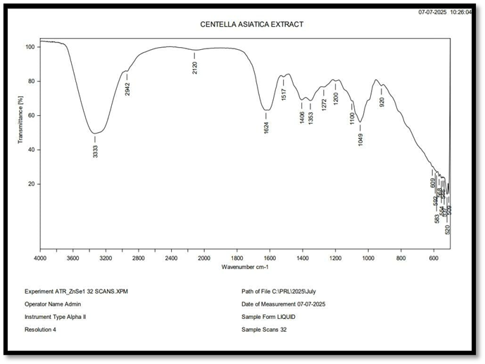 FTIR studies of herbal extracts (Tinospora cordifolia and Centella asiatica) and excipients was performed as shown in figure since, all the functional groups were intact. It was found that the drug and excipients were compatible with each other.