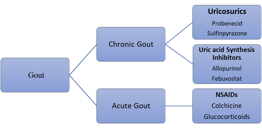 To halt an attack as quickly as possible. A short course of nonsteroidal anti-inflammatory medicines (NSAIDs), such naproxen (Aleve) and ibuprofen (Motrin, Advil), which come in stronger prescription and over-the-counter forms, is probably advised. Because NSAIDs can induce ulcers and intestinal bleeding, they are typically administered to those under 65 who do not use blood thinners or have a history of bleeding. Prescription anti-inflammatory colchicine reduces gout pain, but it can also cause unpleasant side effects like nausea, vomiting, or diarrhoea. Lower dosages have fewer adverse effects and are just as effective as higher dosages. Corticosteroids are also good at rapidly reducing inflammation, but they can have dangerous adverse effects. Gout treatment is guided by specific objectives. Reducing inflammation and discomfort is the main goal during acute flares. The long-term objective is to lower serum urate levels in order to prevent tophi flare-ups and regression. [27]