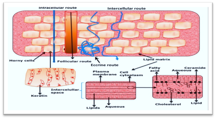Large, flat, polyhedral, plate-like envelopes filled with keratin—a substance derived from dead cells that have moved up from the stratum granulosum—make up the stratum corneum, the outermost layer of the epidermis. Dead cells devoid of nuclei make up the majority of this skin layer. New cells from the stratum germinativum (basale) continuously replace these dead cells when they slough off on the surface in the thin, air-filled stratum disjunction. Ten to fifteen layers of corneocytes make up the stratum corneum, which ranges in thickness from roughly ten to fifteen μm when dry to forty μm when hydrated. It is primarily made up of keratin-rich corneocytes (bricks) arranged in a multi-layered "brick and mortar" structure within an intercellular matrix (mortar) that is made up of triglycerides, cholesterol, cholesterol sulphate, free fatty acids, long chain ceramides, and sterol/wax esters. Keratinocytes in the middle to upper stratum granulosum release their lamellar contents into the intercellular space, generating the intercellular lipid matrix. The stratum corneum's first layers reorganise to create wide, intercellular lipid lamellae, which subsequently unite to form lipid bilayers. The behaviour of the lipid phase differs from that of other biological membranes due to the lipid content of the stratum corneum. An key component of the stratum corneum, water serves as a plasticiser to keep it from cracking and contributes to the production of a natural moisturising factor that keeps it supple. [31] Determining the main route of drug permeation within the stratum corneum is crucial to comprehending the physicochemical characteristics of the diffusing drug and vehicle effect across the stratum corneum. In order to proceed to the next keratinocyte, a molecule that travels by the transcellular route must first partition into and diffuse across the estimated 4–20 lipid lamellae that separate each keratinocyte. For the majority of medicines, this sequence of partitioning into and diffusing across several hydrophilic and hydrophobic domains is not advantageous. As a result, it is presently thought that the intercellular route is the main mechanism that most medications pass through the stratum corneum.[32]