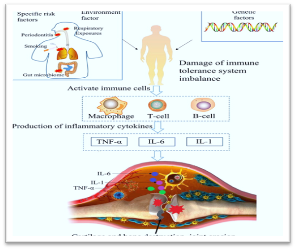 The buildup of uric acid crystals in the joints is the primary cause of gout. Consequently, uric acid buildup triggers the release of inflammatory mediators such as cytokines. This interface causes phagocytes to produce excessive amounts of IL-8, which in turn causes neutrophils to form. The initial development of mast cells and monocytes, followed by neutrophils, is also necessary for the pathologic phase of urarthritis. The UA crystals are flooded by macrophages before to the main gouty arthritis attack. Prominent macrophages possess the ability to retain these crystals without triggering an inflammatory reaction. In contrast, less-differentiated monocytes are produced in response to tumour necrosis factor levels, in addition to epithelial activation after the body's salt crystal process. Due to neutrophil chemotaxis and other inflammatory mediators, the affected areas experience vasodilatations, a rise in endothelial gaps, and an accumulation of macrophages and lymphocytes, all of which contribute to inflammation.