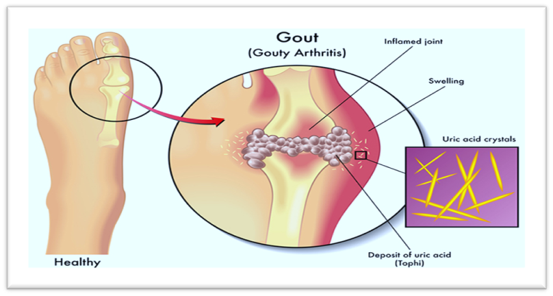When urate crystals accumulate in the joints or soft tissues, a severe condition called gout results. A higher-than-normal blood uric acid content is necessary for the formation of uric acid crystals. Gout is an inflammatory disease that can sometimes be lethal and has negative effects on the body. A lower quality of life is associated with gout, the most prevalent type of inflammatory arthritis [1–3]. Elevated serum uric acid (SUA) levels, or hyperuricaemia, are a prerequisite for the development of gout. As SUA levels increase and physiological saturation thresholds for uric acid are exceeded in body fluids, monosodium urate (MSU) crystals form and accumulate in and around joints. Clinical manifestations of MSU crystal deposition include tophaceous deposits of MSU crystals in the skin and joints, chronic joint damage, and acute flare-ups of severe pain and inflammation affecting peripheral joints, most often the first metatarsophalangeal (MTP) joint. Thanks to current epidemiological studies, we now have a better understanding of the risk factors for the development of gout, the impact of co-morbid illness on mortality and cardiovascular morbidity, and trends in the incidence and frequency of gout [4]. Acute gout, also called podagra when it affects the first metatarsophalangeal joint, is caused by the inflammatory reaction of the joint tissues that results from the development of monosodium urate (MSU) crystals within the joint. The link between crystal deposition and joint inflammation was established by Garrod, who developed the thread-test assay of serum urate, who said that "the deposited urate of soda may be looked upon as the cause, and not the effect, of the gouty inflammation." Early clinical descriptions of acute gout, from Hippocrates to Charcot, highlighted how quickly and inflammatorily an episode might occur.[5] Attacks of gout are typified by sudden, intense symptoms that nearly always happen at night. The first MT joint of the big toe is often affected by the patient's sudden onset of discomfort, which rapidly becomes red and swollen. Veins on the leg may enlarge, turning purple, and sometimes bruising.[6] The biochemical hallmark of gout is extracellular fluid urate saturation, which is characterised by hyperuricemia in the blood with plasma or serum urate concentrations exceeding 6.8 mg/dL (about 400 µmol/L), the approximate limit of urate solubility.[7] Acute gout flares, which are recurring flare-ups of inflammatory arthritis, chronic gouty arthropathy, and accumulation of urate crystals in the form of tophaceous deposits are some of the clinical signs of gout. Chronic nephropathy and uric acid nephrolithiasis