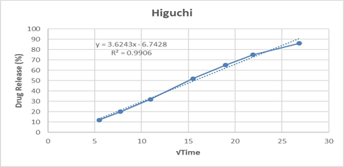 The Higuchi model (R² = 0.9906) also showed a good correlation, implying that the drug release is significantly governed by a diffusion-controlled mechanism through the polymeric matrix. Furthermore, fitting the data to the Korsmeyer–Peppas model yielded an R² of 0.9917 with a release exponent (n = 0.635). Since the value of n lies between 0.5 and 1.0, the mechanism can be characterized as non-Fickian (anomalous) transport, indicating that both diffusion and polymer relaxation/erosion contribute to the overall release mechanism.