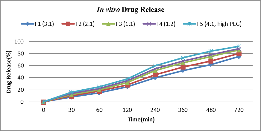 The in vitro drug release profiles (F1–F5) demonstrated the influence of polymer ratio and excipient composition on drug release. After 720 minutes, cumulative release ranged from 75% (F1) to 92% (F5). A reduction in polymer content or increase in hydrophilic excipient accelerated drug release. F1 (3:1 ratio) showed the slowest release, whereas F5 (4:1 with high PEG) achieved the fastest, highlighting PEG’s role in promoting hydration and diffusion. F3 (1:1) exhibited a balanced, sustained profile (86%). Overall, modulation of polymer and PEG ratios effectively governed release kinetics, with F5 providing maximum and F3 optimized sustained release.