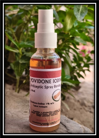 The Povidone-Iodine spray bandage is an innovative, easy-to-use topical formulation designed for rapid wound coverage, antimicrobial protection, and enhanced patient comfort. This formulation combines polyvinyl alcohol (PVA) as the primary film-forming agent to create a transparent, flexible, and breathable layer over wounds. The preparation begins with dissolving 5 g of PVA in 18 ml of distilled water under controlled heating (40–50°C), ensuring a smooth, lump-free solution. To enhance the pliability and adhesive properties of the film, glycerin (2 ml) and propylene glycol (1 ml) are incorporated, functioning as plasticizers. A fast-drying mechanism is achieved through the addition of isopropyl alcohol (35 ml) and acetone or ethanol (40 ml), which act as volatile solvents, promoting rapid film formation upon spraying. The key active ingredient, 10 ml of 10% Povidone-Iodine, is then added for its broad-spectrum antimicrobial and antiseptic properties, essential for infection prevention. Optionally, hydrogen peroxide (3 ml, 3%) may be added to boost antibacterial efficacy through oxidative action. To improve user acceptability, a mild fragrance oil (0.1 ml) can be included. The final volume is brought up to 100 ml with additional distilled water (~18 ml), and the solution's pH is adjusted between 5.0 and 7.0 using citric acid or sodium hydroxide to ensure dermal compatibility. The mixture is thoroughly homogenized and packaged in sterilized spray bottles for hygienic and convenient application. To validate the effectiveness, safety, and quality of the spray bandage, a series of evaluation tests are conducted. These include visual inspection for clarity and uniformity, pH testing for skin compatibility, viscosity measurement to ensure optimal spray ability, and drying time assessment, aiming for a 30–60 second film formation window. An adhesion test confirms proper film adherence to skin-like surfaces without excessive tackiness. The antimicrobial efficacy is verified using standard microbial inhibition assays (e.g., zone of inhibition against Staphylococcus aureus and Escherichia coli). Additionally, skin irritation testing and stability studies under various environmental conditions are performed to ensure long-term safety and product integrity. This comprehensive formulation and quality evaluation approach ensures the production of a safe, stable, and highly effective Povidone-Iodine spray bandage, offering a practical solution for minor wounds, abrasions, and post-operative care in both clinical and home setting