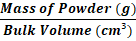 Bulk Density= Mass of Powder (g)Bulk Volume (cm³)