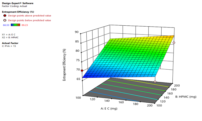 Three dimensional surface plots were generated by the Design Expert® software are presented in (Figure no. Fig.32 and Figure no. Fig.33 for the studied responses, i.e. Mean Drug loading (Y1) and Entrapment Efficiency (Y2). Fig.32 depicts response surface plot of Polymer Conjugate Concentration (X1) and HPH Pressure (X2) on Mean of Drug loading. nanoemulsions being nanoparticulate structures, formulation batch amongst all the design batches giving least particle size will be preferred more and selected as an optimized batch. Where F7 Design Batch, with a polymer concentration of about 150mg and 200mg, show the least particles size i.e. 383.33nm. Fig.33 depicts response surface plot of Polymer Conjugate Concentration (X1) and HPH Pressure (X2) on entrapment efficiency. The 3-D surface image shows a linear response, which indicates with the increase in the polymer concentration the entrapment efficiency increases, as more the polymer available more will be the entrapment efficiency. Here, two design batches i.e. F2 and F7 showed maximum entrapment efficiency i.e. 81.73% and 89.23% respectively. But as seen in first response Surface graph being a nanoparticle formulation considering the least particle size is also a crucial factor. So, the Design Batch with least particle size and maximum entrapment efficiency is selected. Therefore, F7 is considered as an optimized Batch.
