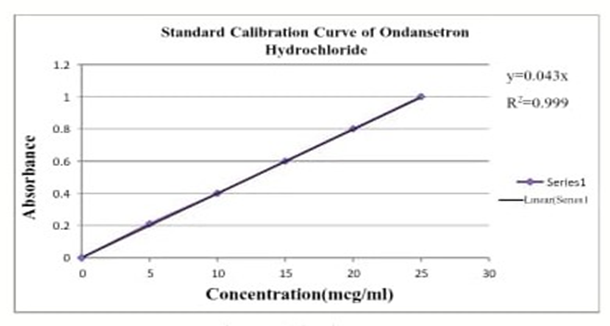 A stock solution of Ondansetron hydrochloride (100mcg/ml) was prepared in phosphate buffer pH 6.8. Five samples comprising 5, 10, 15, 20, 25 mcg/ml were prepared from stock solution in 50 ml volumetric flask. The sample were then analyzed in UV visible spectrophotometer at maximum wavelength of 310nm. The calibration curve was prepared by plotting absorbance versus concentration of Ondansetron hydrochloride,