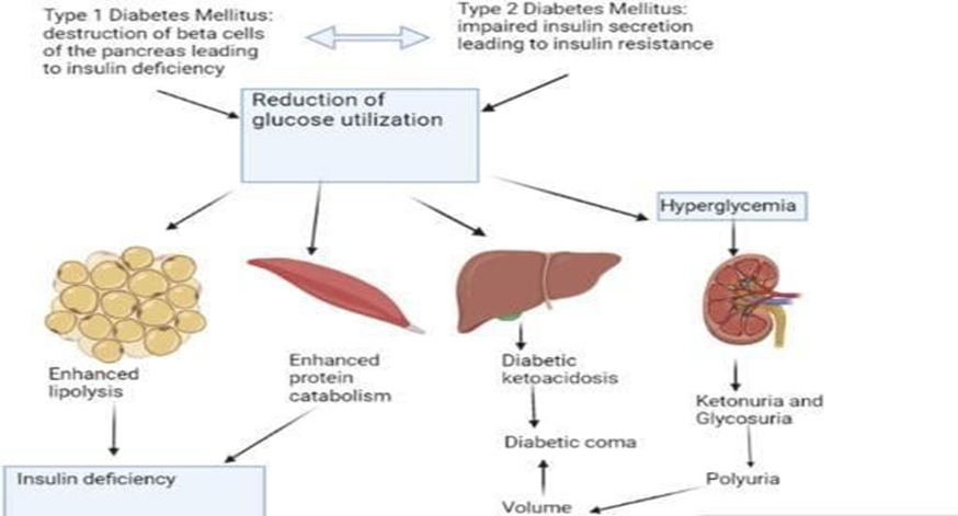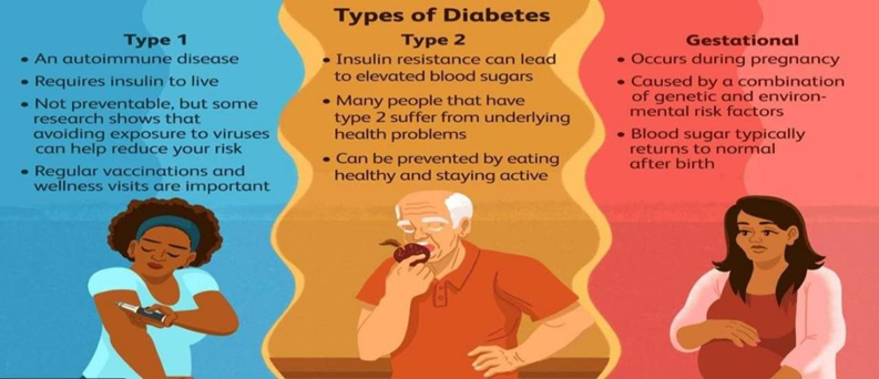 Diabetes is a chronic metabolic disorder characterized by high blood sugar levels over a prolonged period. It results from either the body's inability to produce enough insulin or the cells not responding Type 1, Type 2, and gestational diabetes, each with distinct causes, symptoms, and management strategies. The condition affects millions worldwide and can lead to severe complications if not properly managed, highlighting the importance of research into prevention, treatment, and improved understanding of the disease, effectively to the insulin produced. There are several types of diabetes, including