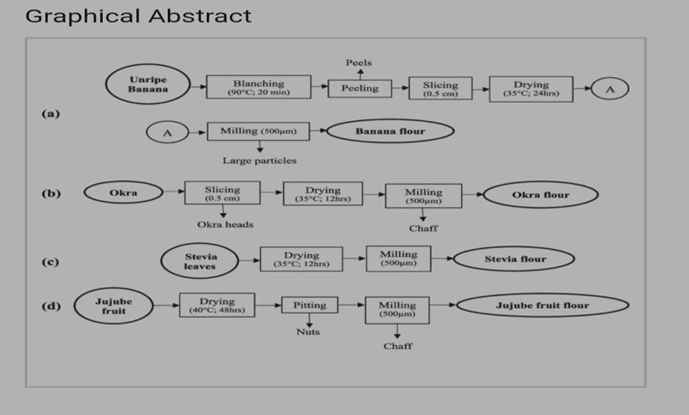 Unripe banana (Musa acuminata), fresh okra (Abelmoschus esculentus), stevia leaves (Stevia rebaudiana) and jujube fruits (Ziziphus mauritiana) were purchased from a local market of Ngaoundere in Adamawa region of Cameroon. Unripe banana, okra, stevia and jujube fruit flours were produced as describe in and stored at 4°C for further utilization. Moisture, ashes, total sugars, simple sugars and crude fibers contents of flours of unripe banana, mature okra fruit, stevia leaves and dry jujube fruit were determined as reported by Tedom et