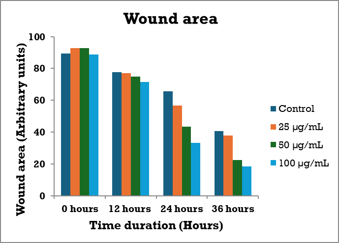 A straight scratch was made on the cell monolayer using a sterile 200 µL pipette tip. Cells were washed once with culture medium to remove debris and fresh medium was added. Scratches of similar width were maintained in all wells. Reference marks were made near the scratch to capture the same field during imaging. Initial images were taken using a phase-contrast microscope. Plates were incubated at 37 °C, and images were captured at 0, 12, 24, and 36 h until the scratch was closed. Final images were taken by aligning the same reference points.Cell migration analysisImages were analysed using ImageJ software. The percentage of wound closure was calculated by comparing the wound area at different time points with that at 0 h. Increased wound closure indicated enhanced cell migration and wound healing activity.
