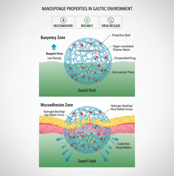 Figure 4: The buoyant and mucoadhesive mechanism of nanosponges in GRDDS