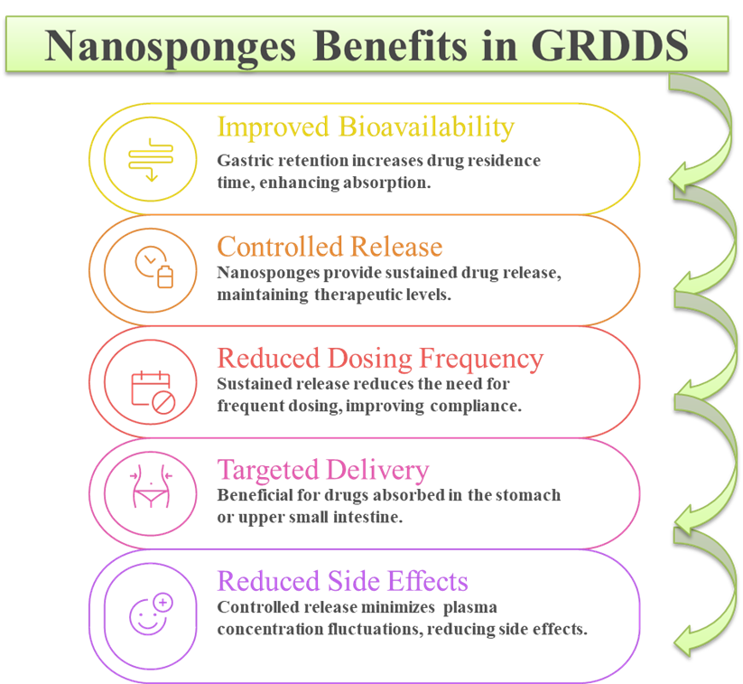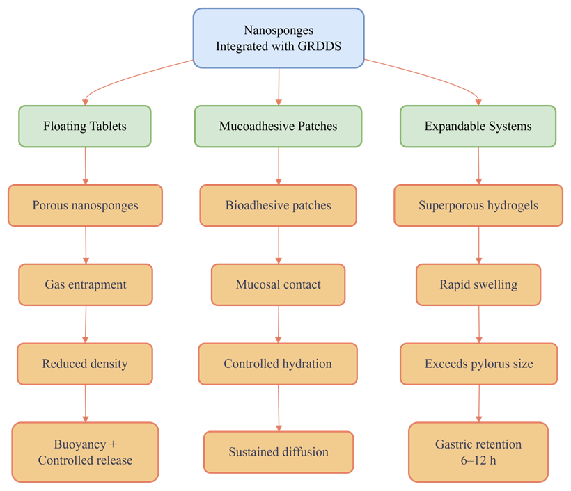Nanosponges can be incorporated into various gastroretentive platforms to create multifunctional delivery systems: They can be integrated into floating systems, mucoadhesive patches, or even pulsatile release formulations to achieve more refined control over drug release profiles and gastric residence times.