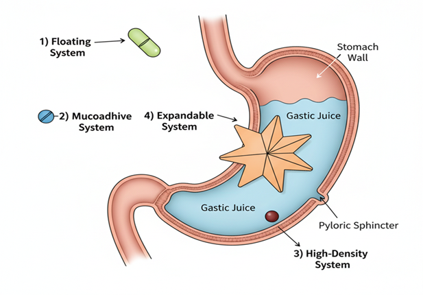 Mucoadhesive systems exploit polymer-mucin interactions to adhere to the stomach's mucous membrane, thereby improving retention and bioavailability. The Bioadhesive Drug Delivery System stands out by ensuring prolonged gastric retention through strong adhesive properties with the gastric mucosa. These systems utilize mucoadhesive polymers such as Carbopol, chitosan, and hydroxypropyl methylcellulose (HPMC) [42].