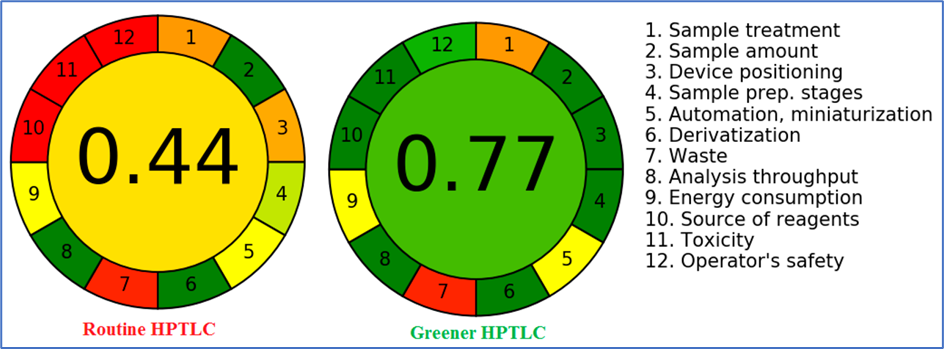 Figure 3 Comparison of conventional HPTLC and greener HPTLC methods evaluated using the AGREE tool.[39]