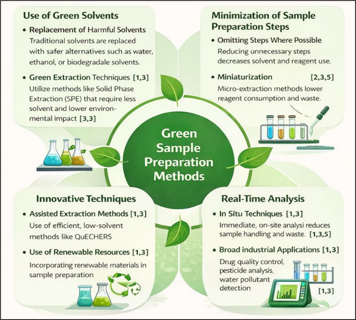 A fundamental strategy in green sample preparation is the replacement of hazardous organic solvents with safer and biodegradable alternatives. Solvents such as water, ethanol, and other environmentally benign media are increasingly preferred to reduce toxicity and environmental pollution [1,3]. In addition, green extraction approaches, including solid-phase extraction (SPE), require lower solvent volumes and often provide enhanced extraction efficiency compared to traditional methods [3].