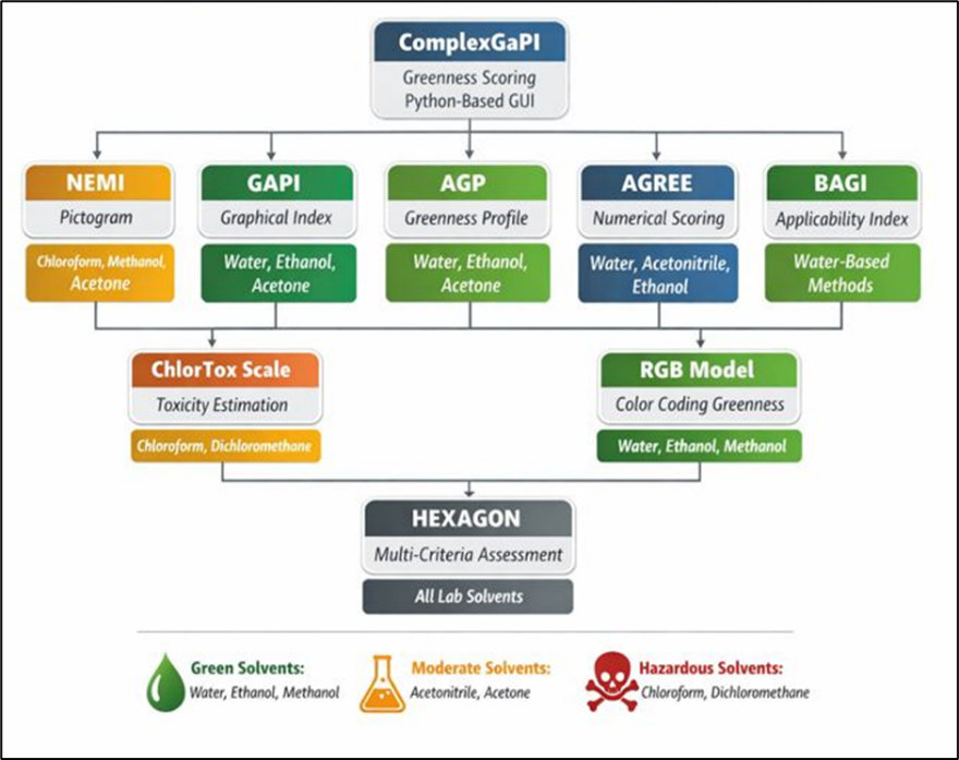 Green chemistry represents a transformative approach in modern chemical and pharmaceutical practices, emphasizing sustainability, safety, and environmental responsibility. By minimizing waste, reducing energy consumption, and promoting the use of safer solvents and renewable materials, green chemistry aligns scientific innovation with ecological preservation. In the analytical domain, Green Analytical Chemistry (GAC) plays a vital role in assessing the environmental impact of laboratory procedures. The development of specialized software tools, such as Complex GAPI, GAPI, AGREE, and HEXAGON, allows researchers to systematically evaluate and improve the greenness of analytical methods. These tools not only facilitate the selection of safer solvents and energy-efficient processes but also encourage adherence to the principles of green chemistry. Overall, integrating green chemistry principles with advanced assessment tools fosters sustainable scientific practices, reduces environmental hazards, and supports the global goal of eco-friendly chemical innovation.