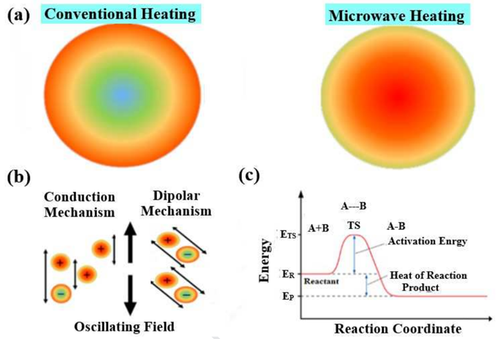 Fig. 2. (a) Temperature profile of reaction mixture after t min as alerted by the treatment in traditional oil bath and microwaves, (b) Representation of oscillating field in conduction and dipolar mechanisms and (c) Activation energy diagram for the chemical reaction under microwave conditions.