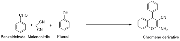 Synthesis of chromene derivatives has been widely used as a model reaction for the application of green chemistry. The reason for this is that it is a relatively simple multi-component reaction between an aldehyde, an active methylene compound and a phenol. Mechanistically, the reaction is a cascade reaction composed of a Knovanagel condensation followed by a Micheal-type addition.35–37