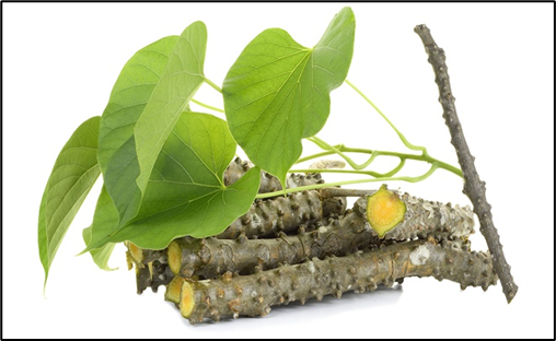 Eighty nine percent of the shrubs used belonged to an important family known as Menispermaceae from the old medical system as a medicine. Giloy translates to Tinospora cordifolia or Guduchi in Hindi language. Raw stem of Giloy is considered to be highly effective due to its rich nutritional value and because it contains alkaloids but stem root as well as leaves can also be utilised.[11] A shloka of Charak Samhita says that Giloy is one of the main herabol that has bitter taste. It is employed in several diseases and has Vata and Kapha reducing properties also. It is also called Heart leaves Moonseed from the shape of the leaves and the hue of the red berry like fruit. Due to the presence of alkaloids, diterpenoids and glycosidic compounds, the plant T.cordifolia is classified as antidiabetic herbal medicine in the Indian Ayurvedic Pharmacopoeia. Many studies and researches both in vitro and in vivo aimed to determine that the three alkaloids, palmatine, jatrorrhizine, and magnoflorin shared the Responsibility for hyperglycemic effect in a way of inhibiting gluconeogenesis process, releasing insulin and stimulate insulin like activity.[12]