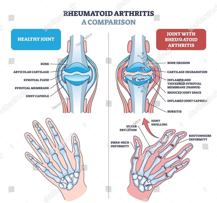 By encouraging the expression of receptor activator of nuclear factor kappa-B ligand (RANKL), which stimulates osteoclast formation and bone resorption, synovial fibroblasts become activated as the inflammatory process advances and contribute to joint destruction. Concurrently, chondrocytes are affected by cytokines, which causes the release of matrix metalloproteinases that break down cartilage. Joint deterioration, deformity, and loss of function follow from this. Furthermore, although the precise mechanisms are still unknown, changes in the microbiome have been noted in RA patients and may contribute to the development and course of the disease. In general, the pathophysiology of RA involves an ongoing cycle of inflammation and autoimmunity that, if left untreated, eventually results in irreversible joint destruction. (8)