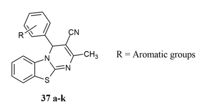 Maged et al. synthesised new derivatives of bicyclic fused rings with bridgehead nitrogen of 3-substituted imidazo/pyrimidine derivatives 37a-k, reacting 2-aminobenzothiazole, acetyl acetone, and different substituted aldehydes in a one-pot reaction, which have biological activities against colon cancer at concentrations ranging from 12.5 to 400 μg/mL 32.