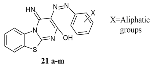 Eris, Kin et al. synthesized and studied 4-imino-3-arylazo-4H-pyrimido [2,1-b] [1,3] benzothiazole-2-oles 21 a-m, for antimicrobial activity against standard Ciprofloxacin with 24 to 28 ± 1.2 mm of zone of inhibition for S.aureus, B.subtilis, K.prneumoniae and E.coli 16 to 32 mm. The dyes were obtained by coupling carbocyclic amine-based diazonium chloride with compound 16.