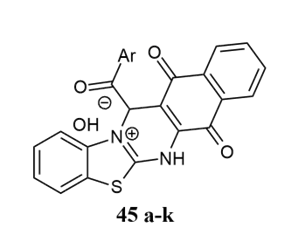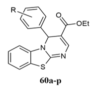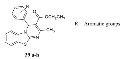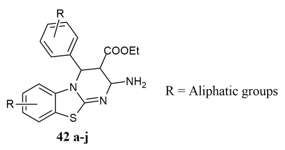 Sahu et al. synthesised 4H-pyrimido[2,3-b]benzothiazole derivatives 39a-h using aromatic aldehydes, ethyl acetoacetate, and 2-aminobenzothiazole in the presence of L-proline under solvent conditions using Petra/Osiris/molinspiration(POM) analysis for antitumour activity on human cell lines MCF-7, HELA, and Hep-G2 against Doxorubicin as standard 34.