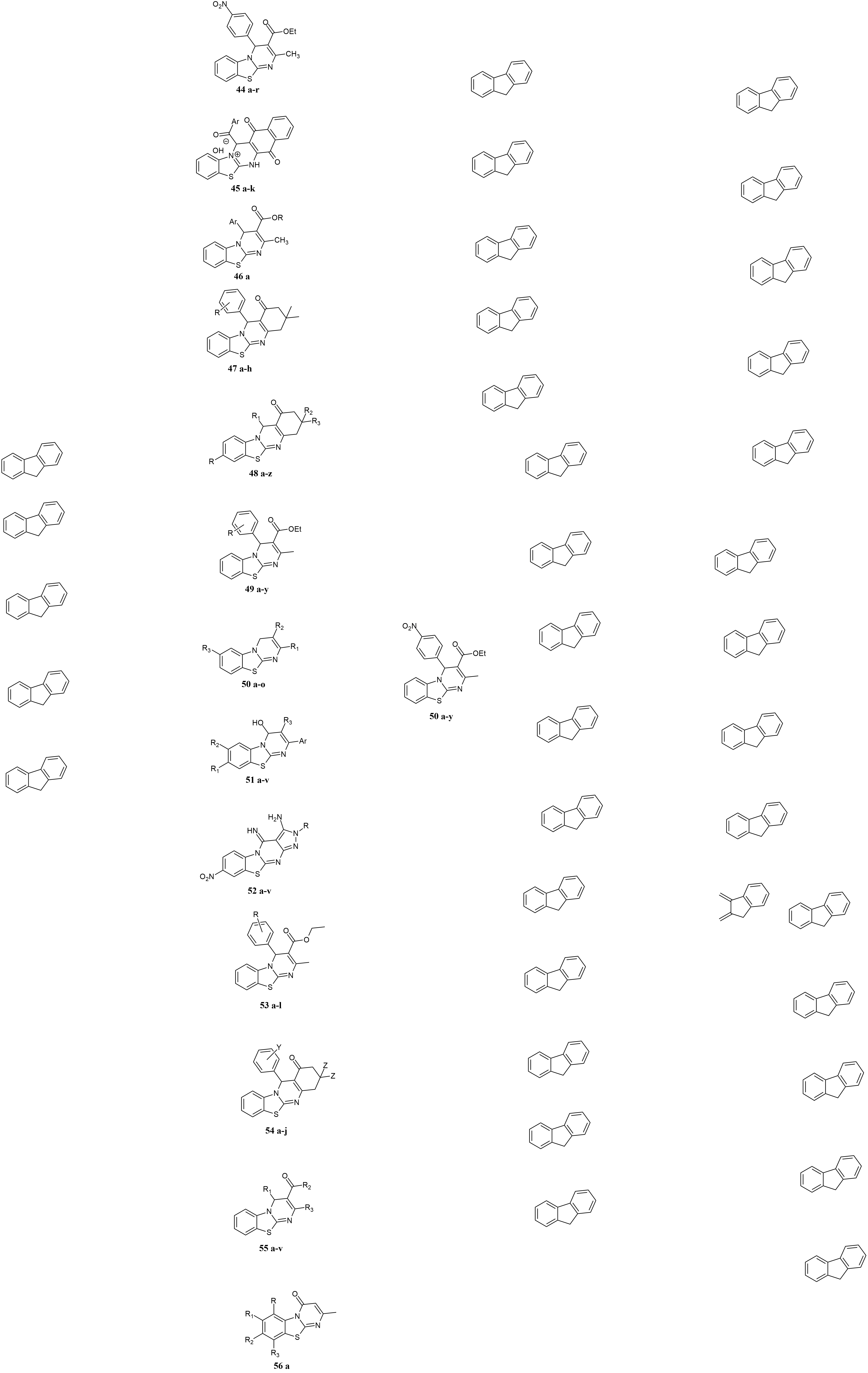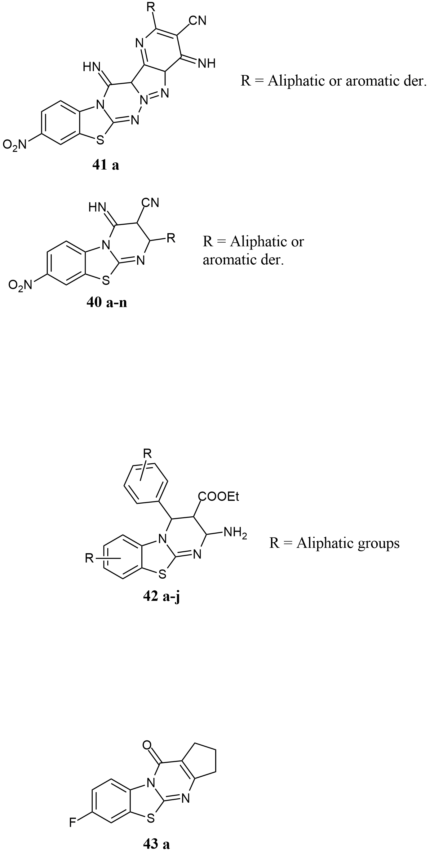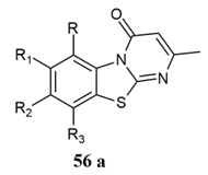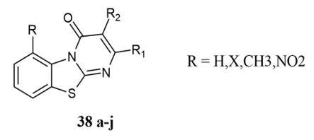 Hilal et al. synthesised 8-fluoro-2-methyl-4H-pyrimido [2,1-b][1,3]benzothiazole-4-one 43a showed antifungal activity against griseofulvin, nystatin, and hymexazol as a standard, with 24.3 to 81 % inhibition of different bacteria like M.canis, F. tricinctum, P.ultimum, P.aphanidermatum, and P.middletonii in the range of 44.4 to 100 % as compared to reference compounds. And 8-fluoro-2,3-trimethylene-4H-pyrimido [2,1-b][1,3]benzothiazole-4-ones via condensation of β-keto esters with 2-aminopyridine derivatives, which were characterized by elemental analysis 38.
