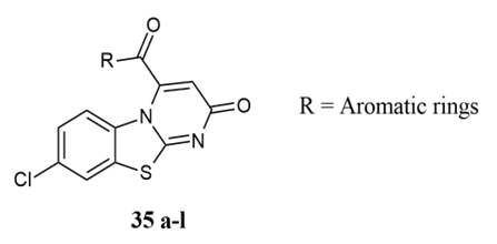 Gabr et al. synthesised pyrimido[2,1-b]benzothiazole derivatives 35a-l which shows the broad spectrum of antitumour activity at a single dose a (10 uM) activity against a panel of 60 cancer cell lines at the GI50 and TGI levels, then some prominent compounds are further studied for five dose level screening which gives GI50 = 0.44 mM, TGI =1.2 mM and LC50 MG-MID = 6.6 mM) and 4 (GI50 = 0.77 mM, TGI = 2.08 mM and LC50 MG-MID = 11.74 mM potent value in this study for CCRF-CEM (Leukemia), NCI-H522( Non small cell lung cancer), HT29 (Colon cancer), SNB-75 (CNS cancer), LOX IMVI (Melanoma), IGROV1(Ovarian cancer), CAKI-1 (Renal cancer), PC-3 (Prostate cancer) and MDA-MB-468 (Breast cancer) 30.