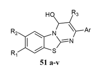 Venkatesh et al. reported the synthesis of novel substituted Phenyl-1,5-dihydro-2H-benzo[4,5]thiazolo[3,2-a]pyrimido[4,5-d]pyrimidine 27 a-m derivatives as a one-pot synthesis against different bacterial strains with Minimum inhibitory concentration (MIC) values of 50-500 µg/mL when compared to the standard drugs Ciprofloxacin, Bavistin for S.aureus, S. typhi, P.syringae, X.campestris, E. coli, A.flavus, F.oxysporum, C.albicans, C.keratinophilum bacteria, and also showed antifungal activity 22.