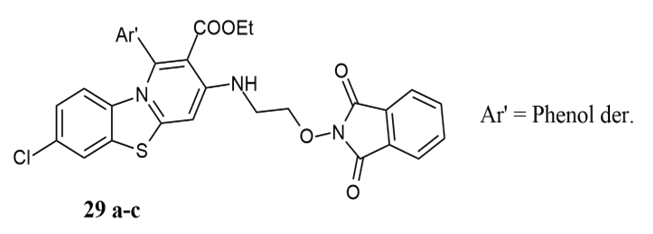 Sain et al. reported new and simple ways for synthesizing ethyl-8-chloro-4-(4-substituted phenyl)-2[(Nethoxyphthalimido)amino]-4H-pyrimidino[2,1-b1,3]benzothiazole-3-carboxlates 29 a–c & 6-chloro-N-[3-{2-(4-substitutedphenyl)ethenyl} [1-N ethoxyphthalimido quinoxaline-2(1H)-ylidene] -1,3-benzothiazole-2-amines.All of the compounds demonstrated good to moderate antibacterial activity against Ciprofloxacin, 16-18 mm zone of inhibition for P.mirabilis, K. pneumonia, E.coli, and P.aureoginosa, with the range of 7 to 27 mm 24.