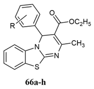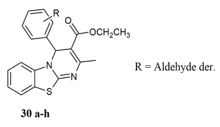 Sahu et al. prepared 4H-pyrimido[2,1-b]benzothiazole derivatives 30a-h, used Petra/osiris/molinspiration (POM) analyses with the advantage of short reaction time, no side products, and easy to work with evaluated in vitro antimicrobial activity with ciprofloxacin (for antibacterial strains) with 1.62 or 3.25 µM/mL Minimum inhibitory concentration for S. aureus, P. aeruginosa, S. typhi, E. coli, B. cereus, and P. rettegeri 25.