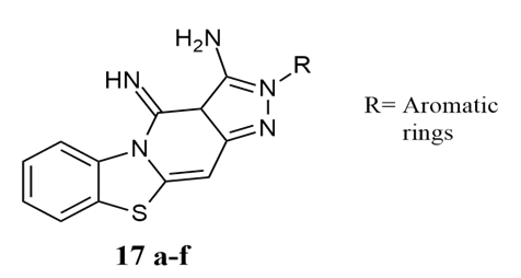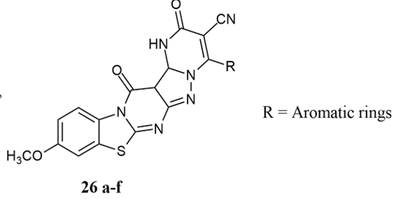 Badne et al. synthesised 2-oxo-3-cyano-4 thiomethyl-10-methoxy-14-oxo-14H-pyrazolo (5,6-d) pyrimido (6,7-c) pyrimido [2,3-b] benzothiazole 26a-f had synthesized which were tested for their antimicrobial activities in a range of 10-19 mm of zone of inhibition for S.aureus and E.coli using the Disc diffusion technique at a temperature 37?C against Penicillin as a standard, with 24 and 20 mm, respectively 21.
