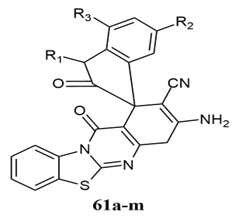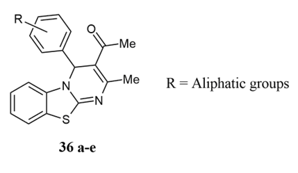 Chadegani et al. synthesised 2-aminobenzothiazole, benzaldehyde derivatives, β-ketoester, β-diketone or malonate derivatives in solvent-free conditions, providing the corresponding pyrimido[2,1-b]benzothiazole derivatives 36a-e 60-70% yields, optimistic time, high bond forming efficiency,solvent-free reaction conditions 31.