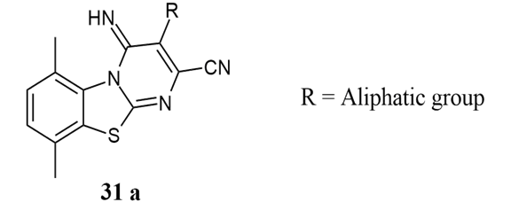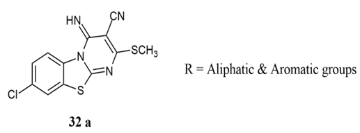 Waghamare et al. synthesised and in-vitro anticancer activity of 3-cyano-6,9-dimethyl 4-imino 2-methylthio-4H-pyrimido[2,1-b][1,3] benzothiazole and its 2-substituted derivatives 31a exhibited better anticancer activity against 60 cell cancer lines panels one of which in presence of two methyl and –SCH3 groups in nucleus showed against lung cancer, renal cancer and breast cancer, like wise in presence of p-CH3 and p-OCH3 group some of it exhibited remarkable percentage growth inhibition against HOP-92 (Lung cancer), UACC-62 (Melanoma), and HOP-92 (Lung cancer), UACC-62 (Melanoma). The presence of p-Cl group exhibited excellent activity against K-562, RPMI-8226 (Leukemia), HOP- 92 (Lung cancer), UO-31 (Renal cancer) cell lines panel, also due to presence of due to presence of heteryl cyclic amines at 2-positions exhibited inhibitory effect against CAKI-1, UO-31 (Renal cancer), MCF-7 (Breast cancer) and K-562 (Leukemia), CAKI-1, UO-31 (Renal cancer), PC-3 (Prostrate cancer) 26.