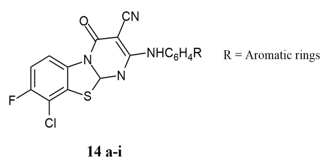 Singh et al. developed a series of 2-substituted-9-chloro-fluropyrimido[2,1-b]benzothiazole-3-cynao-4(H)-one 14a-i and tested their antibacterial, anti-inflammatory, and antifungal properties in vitro and in vivo. The selected compounds showed activity against B.subtilis, S.aureus, Pseudomonas, and E.coli by the cup plate method, which exhibited zone of inhibition 8-22 mm against the standard of Procain Pencillin and Streptomycin for 50 µg and 100 µg concentration, with 20,22,18,21, and 19,21,20,22 mm of inhibition. It also used the minimum inhibitory concentration method for the same bacteria with relatively significant inhibitory action in the range of 50-800 µ/ml 10.