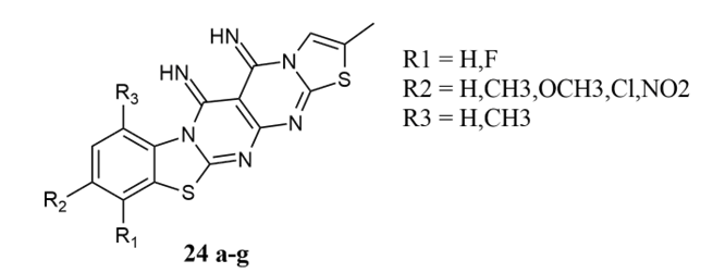 Pawde et al. recently synthesized the thiazolo pyrimido pyrimido benzothiazole derivative 12,13-diimino-9-methyl-thiazolo[2,3-a]-4H-pyrimido[4,5-d]-4H-pyrimido[2,1-b]benzothiazole 24a-g, demonstrated significant antibacterial activity against Penicillin as a standard with 26,28 mm of zone of inhibition for E.coli and B. subtilis bacteria in the range of 4 to 14 mm using the disc diffusion method, and antioxidant activity using the DPPH assay with penicillin and ascorbic acid as standards, respectively 19.