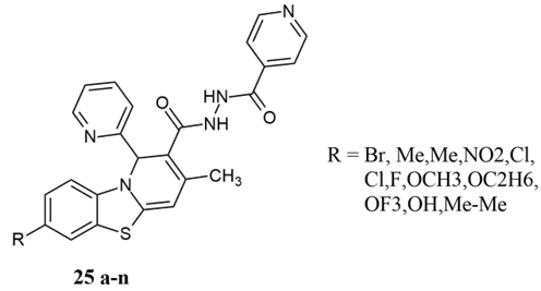 Bhoi et al. synthesized a variety of unique N'-isonicotinoyl-2-methyl-4(pyridine-2-yl)-4H-benzo[4,5]thiazolo[3,2-a]pyrimidine-3-carbohydrazide 25 a-n analogues using a standard approach. All synthesized analogues are tested in vitro for antibacterial and anti-mycobacterial activity against the Mycobacterium tuberculosis H37Rv strain. The minimum inhibitory concentration ranges from 6.25 to 62.5 µg/mL, with the most powerful molecule at 6.25 µg/mL 20.